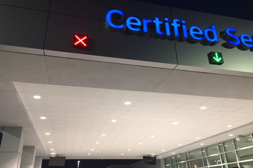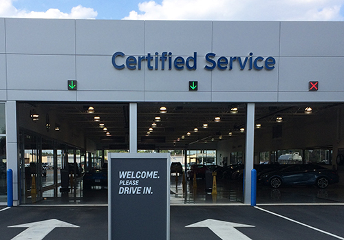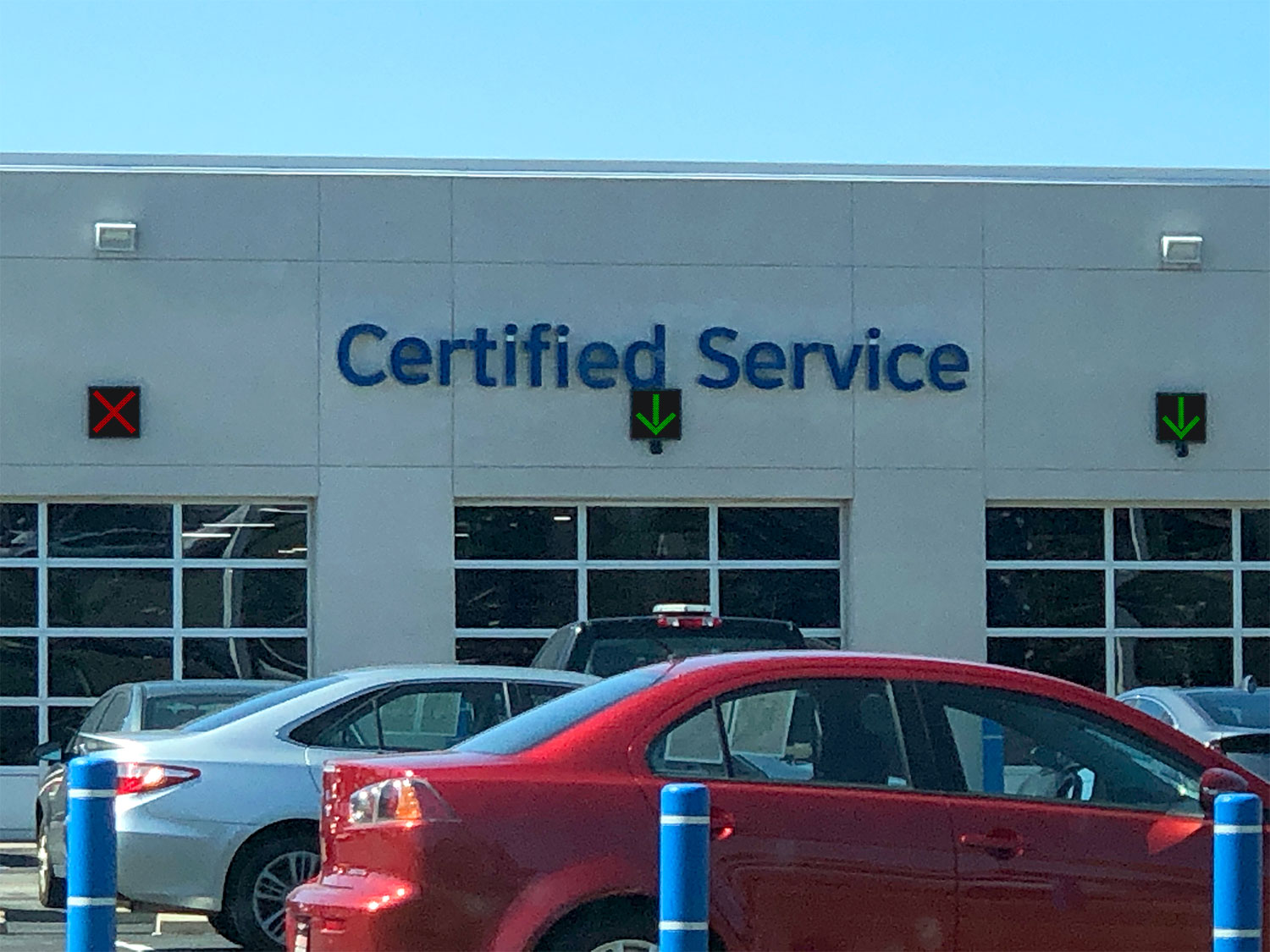 X Down Arrow signs at Service Department Entrance, Caruso Ford, Long Beach, CA