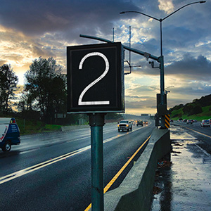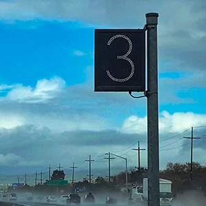 The HOV lane signs were installed on, or nearby, toll gantries so enforcement officers could see the setting of each vehicle’s tag transponder as they pass through. These LED numeric beacons feature a double face (front and back), so data can be shown upstream or downstream from the toll zone and feature the numerals “1,” “2,” or “3” on the display, depending on the transponder tag’s setting.