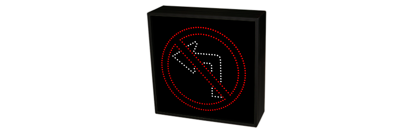 Outdoor/indoor blank-out signs with an IP55/NEMA 3RX cabinet, narrow-angle LEDs, and contrasting black face. The sign message is formed by visible LEDs that illuminate when activated and blank-out when deactivated.