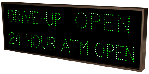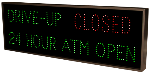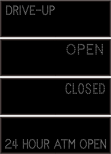 This TCL Series DRIVE-UP | 24 HOUR ATM OPEN | OPEN | CLOSED outdoor, blank-out sign is designed with super bright LEDs and a contrasting face; we guarantee it's readable in direct sunlight. The sign message is formed by visible LEDs on a black sign face and is designed to illuminate the message(s) when turned on and blank out or extinguish the message when off.