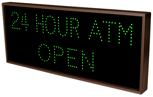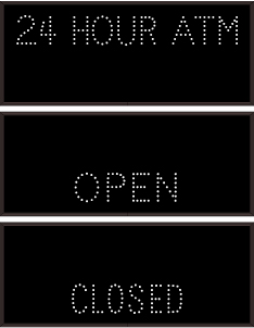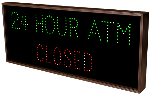 This TCL Series 24 HOUR ATM | OPEN | CLOSED outdoor, blank-out sign is designed with super bright LEDs and a contrasting face; we guarantee it's readable in direct sunlight. The sign message is formed by visible LEDs on a black sign face and is designed to illuminate the message(s) when turned on and blank out or extinguish the message when off.