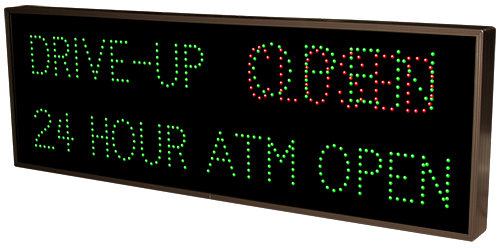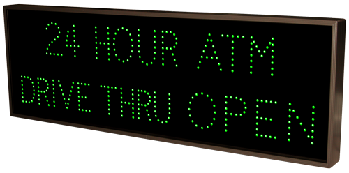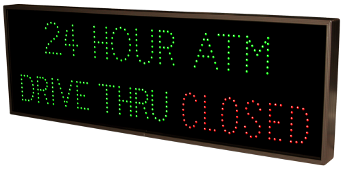 This TCL Series 24 HOUR ATM | DRIVE THRU | OPEN | CLOSED (120-277VAC) outdoor, blank-out sign is designed with super bright LEDs and a contrasting face; we guarantee it's readable in direct sunlight. The sign message is formed by visible LEDs on a black sign face and is designed to illuminate the message(s) when turned on and blank out or extinguish the message when off.