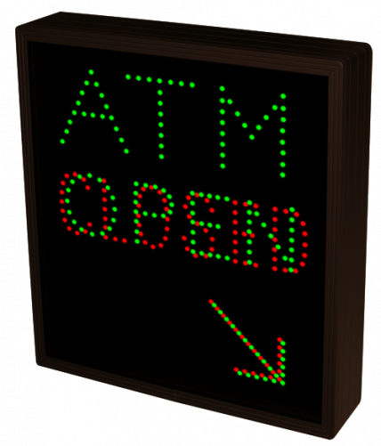 This TCL Series ATM | OPEN Down Right Arrow | CLOSED Down Right Arrow (120-277VAC) outdoor, blank-out sign is designed with super bright LEDs and a contrasting face; we guarantee it's readable in direct sunlight. The sign message is formed by visible LEDs on a black sign face and is designed to illuminate the message(s) when turned on and blank out or extinguish the message when off.