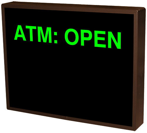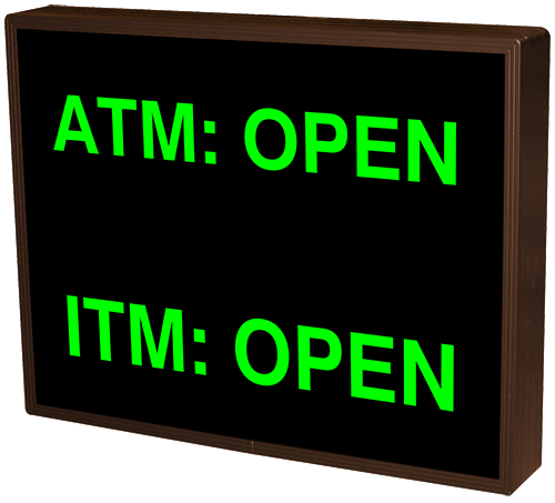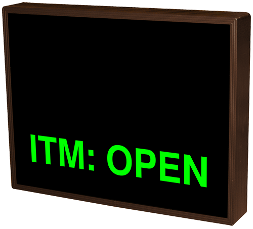 This PHX Series ATM: OPEN | ITM: OPEN (120-277VAC) outdoor, blankout sign is designed with high-intensity, LED reflected, backlit illumination and a block letter-style message face. The sign message illuminates when turned on and blanks out or extinguishes when off. PHX Series signs are guaranteed readable in direct sunlight.