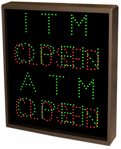 This TCL Series ITM | OPEN | CLOSED | ATM | OPEN | CLOSED (120-277VAC) outdoor, blank-out sign is designed with super bright LEDs and a contrasting face; we guarantee it's readable in direct sunlight. The sign message is formed by visible LEDs on a black sign face and is designed to illuminate the message(s) when turned on and blank out or extinguish the message when off.