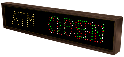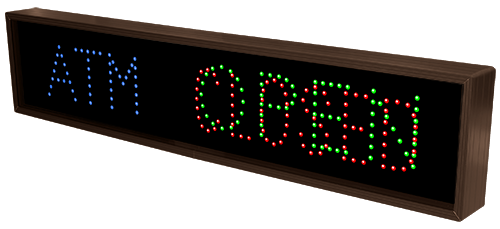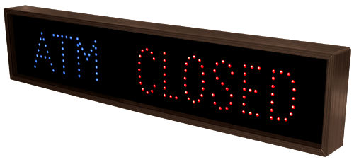 This TCL Series ATM | OPEN | CLOSED (120-277VAC) outdoor, blank-out sign is designed with super bright LEDs and a contrasting face; we guarantee it's readable in direct sunlight. The sign message is formed by visible LEDs on a black sign face and is designed to illuminate the message(s) when turned on and blank out or extinguish the message when off.