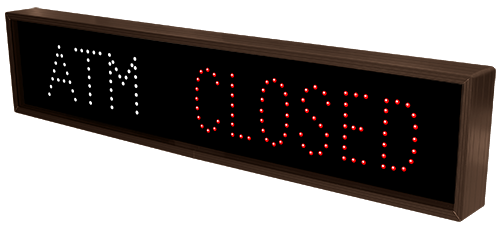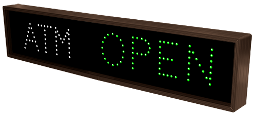 This TCL Series ATM | OPEN | CLOSED (12-24VDC) outdoor, blank-out sign is designed with super bright LEDs and a contrasting face; we guarantee it's readable in direct sunlight. The sign message is formed by visible LEDs on a black sign face and is designed to illuminate the message(s) when turned on and blank out or extinguish the message when off.