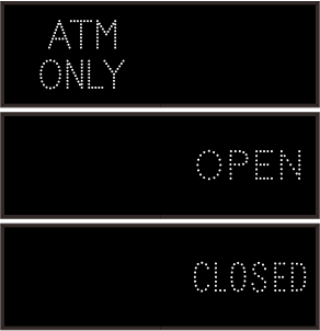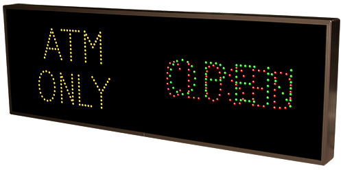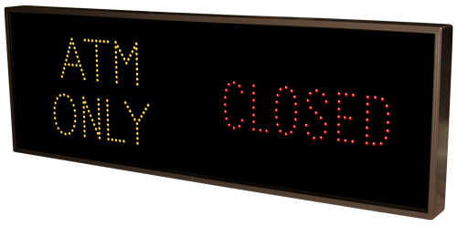 This TCL Series ATM ONLY | OPEN | CLOSED outdoor, blank-out sign is designed with super bright LEDs and a contrasting face; we guarantee it's readable in direct sunlight. The sign message is formed by visible LEDs on a black sign face and is designed to illuminate the message(s) when turned on and blank out or extinguish the message when off.