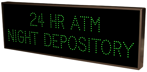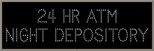 This TCL Series 24 HR ATM NIGHT DEPOSITORY outdoor, blank-out sign is designed with super bright LEDs and a contrasting face; we guarantee it's readable in direct sunlight. The sign message is formed by visible LEDs on a black sign face and is designed to illuminate the message(s) when turned on and blank out or extinguish the message when off.