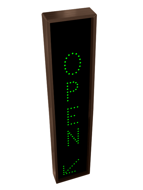 It is engineered with a solid-state circuit board and switch-mode power supply for maximum LED life. The cabinet is constructed of corrosion-resistant, extruded aluminum and ships with our Lift'N Shift back for wall mounting. Ceiling, post and wall-projection mountings are available. Standard cabinet finish is Duranodic Bronze; custom paint finishes are available. Sign can be controlled by a switch or third-party relay. Control switch can be purchased separately. UL/cUL Listed for wet locations.