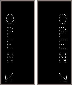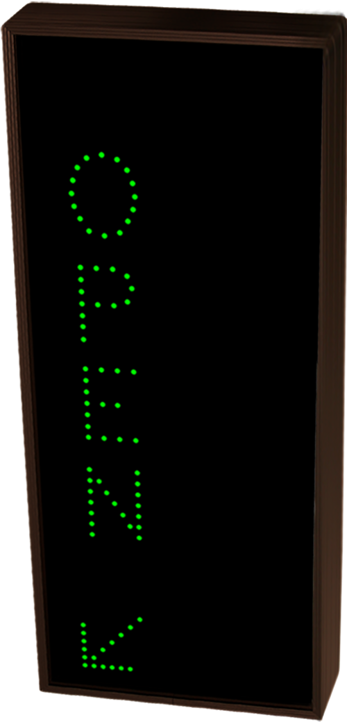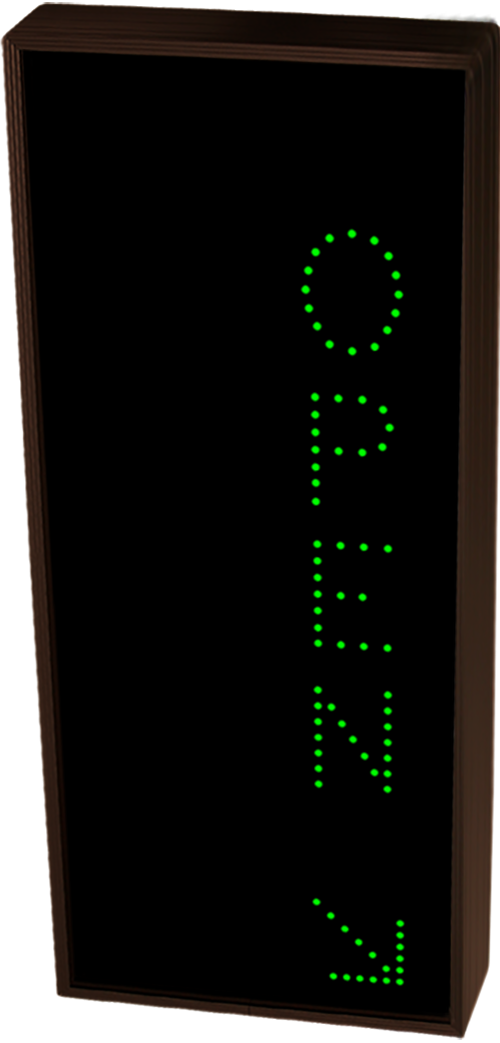 This TCL Series OPEN w/Down Left Arrow | OPEN w/Down Right Arrow (120-277VAC) outdoor, blank-out sign is designed with super bright LEDs and a contrasting face; we guarantee it's readable in direct sunlight. The sign message is formed by visible LEDs on a black sign face and is designed to illuminate the message(s) when turned on and blank out or extinguish the message when off.