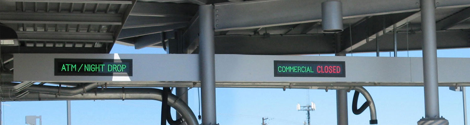 Often bank drive-thru lanes are used for more than personal drive up teller services. A drive-thru lane may be used for both 24 hr ATM and business night deposit or a teller drive up lane may only be used for COMMERCIAL transactions. Our drive-thru signs are available in LED backlit or direct-view illumination, specifically designed to be readable in direct sunlight.