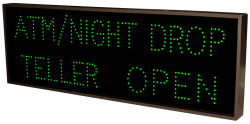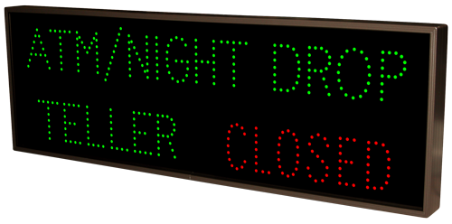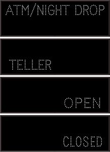 This TCL Series ATM/NIGHT DROP | TELLER | OPEN | CLOSED outdoor, blank-out sign is designed with super bright LEDs and a contrasting face; we guarantee it's readable in direct sunlight. The sign message is formed by visible LEDs on a black sign face and is designed to illuminate the message(s) when turned on and blank out or extinguish the message when off.