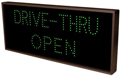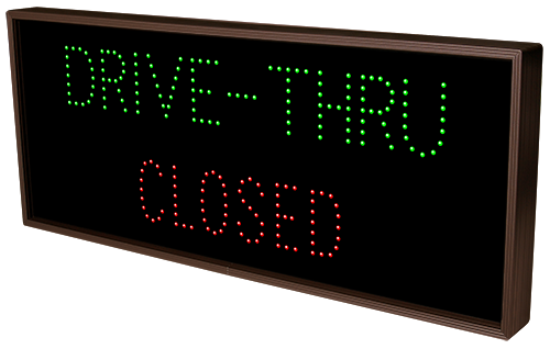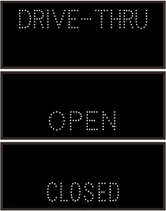This TCL Series DRIVE-THRU | OPEN | CLOSED outdoor, blank-out sign is designed with super bright LEDs and a contrasting face; we guarantee it's readable in direct sunlight. The sign message is formed by visible LEDs on a black sign face and is designed to illuminate the message(s) when turned on and blank out or extinguish the message when off.