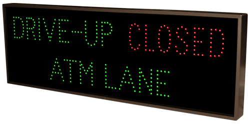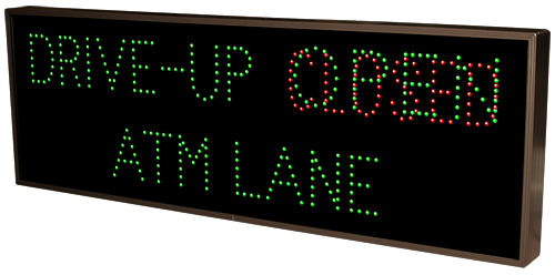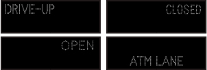This TCL Series DRIVE-UP | ATM LANE | OPEN | CLOSED (120-277VAC) outdoor, blank-out sign is designed with super bright LEDs and a contrasting face; we guarantee it's readable in direct sunlight. The sign message is formed by visible LEDs on a black sign face and is designed to illuminate the message(s) when turned on and blank out or extinguish the message when off.