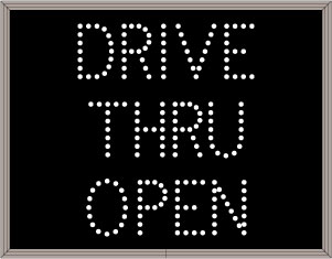 This TCL Series DRIVE THRU OPEN (120-277VAC) outdoor, blank-out sign is designed with super bright LEDs and a contrasting face; we guarantee it's readable in direct sunlight. The sign message is formed by visible LEDs on a black sign face and is designed to illuminate the message(s) when turned on and blank out or extinguish the message when off.