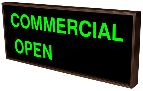 This PHX Series COMMERCIAL | OPEN | CLOSED outdoor, blankout sign is designed with high-intensity, LED reflected, backlit illumination and a block letter-style message face. The sign message illuminates when turned on and blanks out or extinguishes when off. PHX Series signs are guaranteed readable in direct sunlight.
