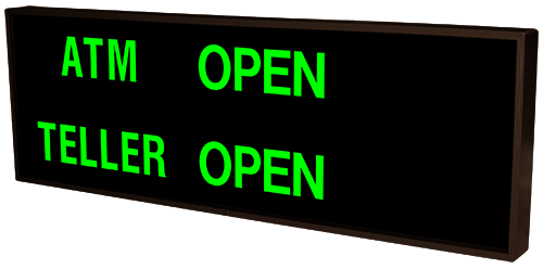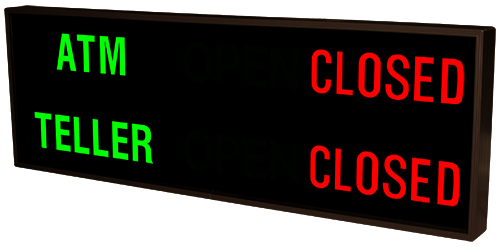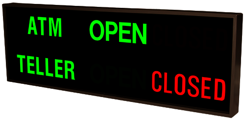 This PHX Series ATM | OPEN | CLOSED | TELLER | OPEN | CLOSED outdoor, blankout sign is designed with high-intensity, LED reflected, backlit illumination and a block letter-style message face. The sign message illuminates when turned on and blanks out or extinguishes when off. PHX Series signs are guaranteed readable in direct sunlight.