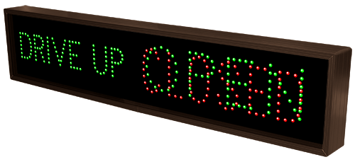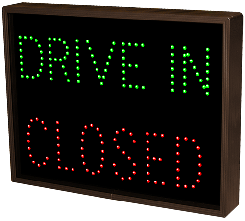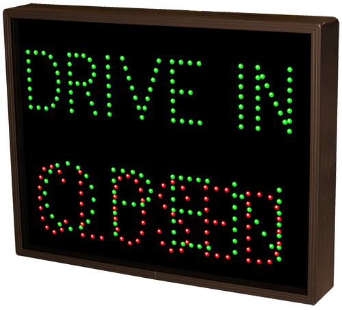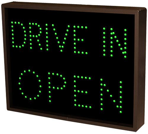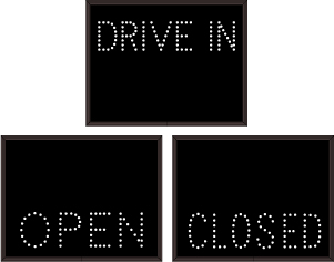 This TCL Series DRIVE IN | OPEN | CLOSED (120-277VAC) outdoor, blank-out sign is designed with super bright LEDs and a contrasting face; we guarantee it's readable in direct sunlight. The sign message is formed by visible LEDs on a black sign face and is designed to illuminate the message(s) when turned on and blank out or extinguish the message when off.