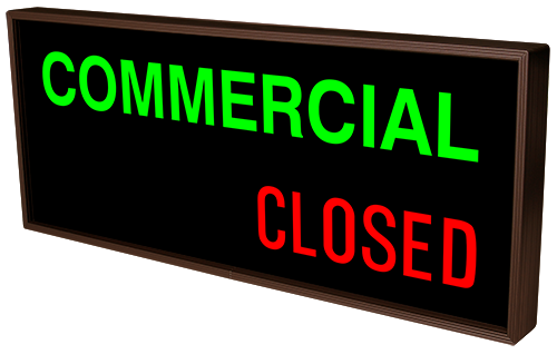 This PHX Series COMMERCIAL | OPEN | CLOSED outdoor, blankout sign is designed with high-intensity, LED reflected, backlit illumination and a block letter-style message face. The sign message illuminates when turned on and blanks out or extinguishes when off. PHX Series signs are guaranteed readable in direct sunlight.