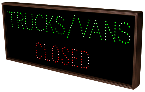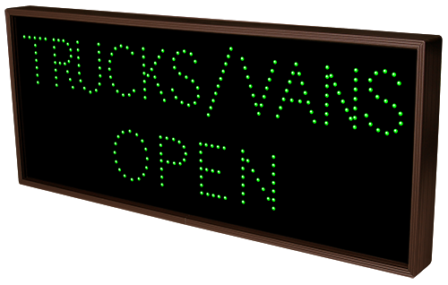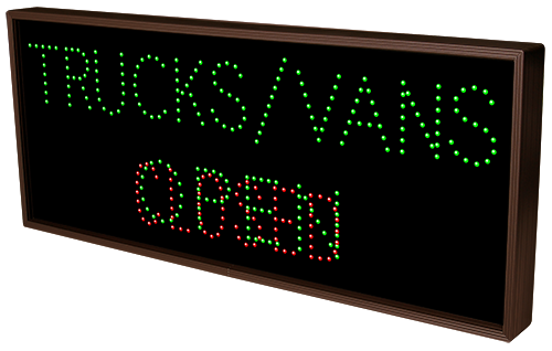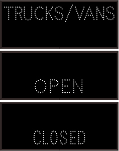This TCL Series TRUCKS/VANS | OPEN | CLOSED (120-277VAC) outdoor, blank-out sign is designed with super bright LEDs and a contrasting face; we guarantee it's readable in direct sunlight. The sign message is formed by visible LEDs on a black sign face and is designed to illuminate the message(s) when turned on and blank out or extinguish the message when off.
