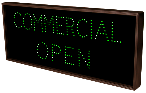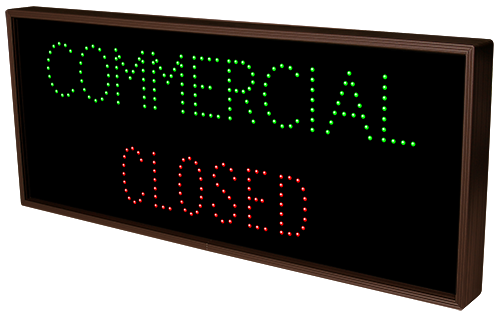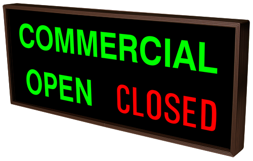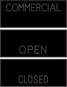 This TCL Series COMMERCIAL | OPEN | CLOSED (12-24VDC) outdoor, blank-out sign is designed with super bright LEDs and a contrasting face; we guarantee it's readable in direct sunlight. The sign message is formed by visible LEDs on a black sign face and is designed to illuminate the message(s) when turned on and blank out or extinguish the message when off.