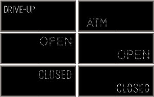This TCL Series DRIVE-UP | OPEN | CLOSED| ATM | OPEN | CLOSED outdoor, blank-out sign is designed with super bright LEDs and a contrasting face; we guarantee it's readable in direct sunlight. The sign message is formed by visible LEDs on a black sign face and is designed to illuminate the message(s) when turned on and blank out or extinguish the message when off.