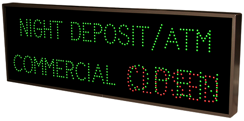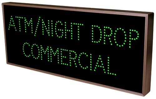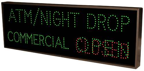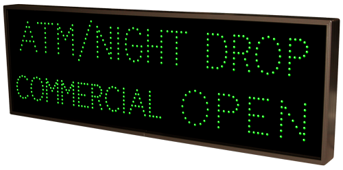 This TCL Series ATM/NIGHT DROP | COMMERCIAL | OPEN | CLOSED (120-277VAC) outdoor, blank-out sign is designed with super bright LEDs and a contrasting face; we guarantee it's readable in direct sunlight. The sign message is formed by visible LEDs on a black sign face and is designed to illuminate the message(s) when turned on and blank out or extinguish the message when off.