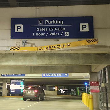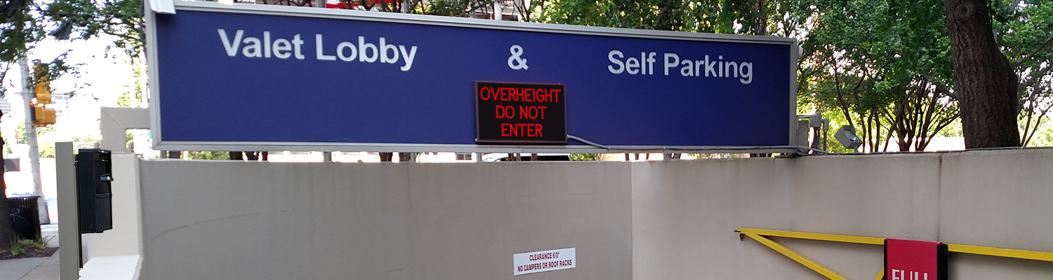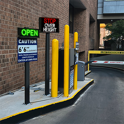 While illuminated, the LED sign — readable in direct sunlight — alerts drivers that their vehicle is overheight and could cause a collision with an overhang, ceiling, or canopy, ultimately causing damage to the vehicle and the facility.