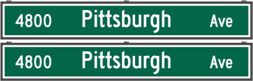 This 4900 Pittsburgh Ave | 4800 Pittsburgh Ave SNS series sign is internally illuminated and features printed graphics on a translucent, prismatic retroreflective vinyl that is applied on the second surface of a UV-resistant, 0.125-inch high-impact acrylic face panel. The cabinet is constructed of lightweight, extruded aluminum alloy with a black finish, hinged doors, and lockable latches. NEMA3X/IP55. Voltage range is 100-277VAC.