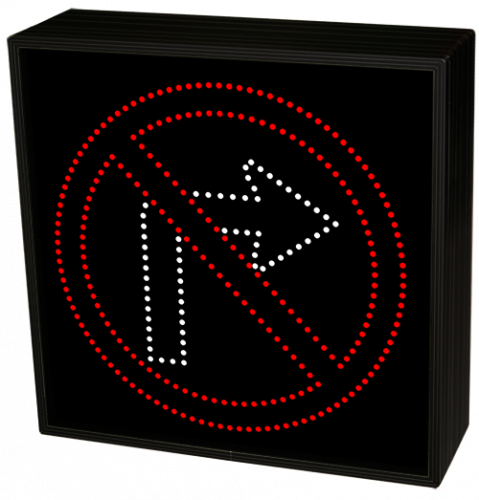 This STR Series R3-1 NO RIGHT TURN SYMBOL outdoor, highway-grade blank-out sign is designed with a NEMA 3R cabinet, super bright LEDs and a contrasting face; guaranteed readable in direct sunlight. The sign message is formed by strategically placed visible LEDs on a black sign face and is designed to illuminate the message or messages when turned on and blank-out or extinguish the message when off.