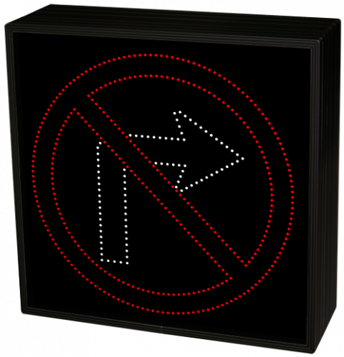 This STR Series R3-1 NO RIGHT TURN SYMBOL outdoor, highway-grade blank-out sign is designed with a NEMA 3R cabinet, super bright LEDs and a contrasting face; guaranteed readable in direct sunlight. The sign message is formed by strategically placed visible LEDs on a black sign face and is designed to illuminate the message or messages when turned on and blank-out or extinguish the message when off.