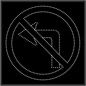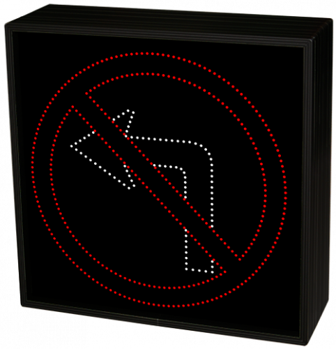 This STR Series R3-2 NO LEFT TURN SYMBOL (120-277VAC) outdoor, highway-grade blank-out sign is designed with a NEMA 3R cabinet, super bright LEDs and a contrasting face; guaranteed readable in direct sunlight. The sign message is formed by strategically placed visible LEDs on a black sign face and is designed to illuminate the message or messages when turned on and blank-out or extinguish the message when off.