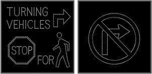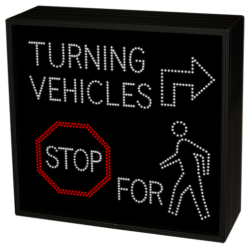 TURNING VEHICLES w/ Right Arrow STOP FOR Pedestrians ImageTURNING VEHICLES w/ Right Arrow STOP FOR Pedestrians White, Red Narrow Angle LED 3.875", 8.375", 13.375", 3.625", 17.125"