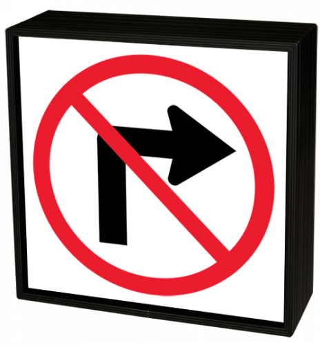 This STRi Series R3-1 No Right Turn Symbol, highway-grade internally illuminated LED traffic sign is designed with a NEMA 3R cabinet, high-intensity reflected LEDs and a block letter style message face.