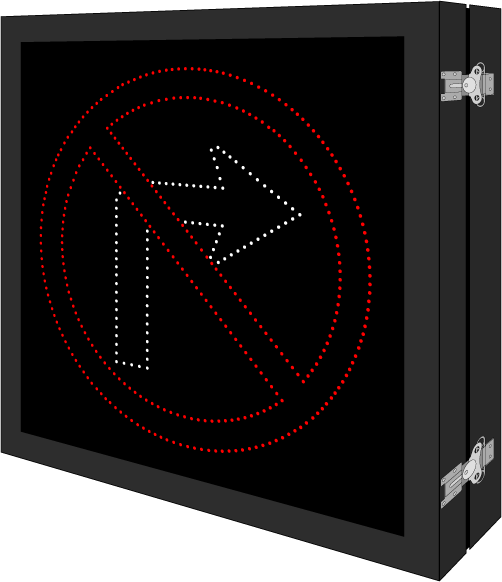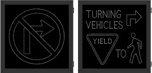 This DOT Series R3-1 No Right Turn Symbol | R10-15R TURNING VEHICLES Right Turn Arrow YIELD TO Pedestrian Symbol sign is a direct-view LED design that illuminates red, white, and amber when activated and blanks out when deactivated. Outside cabinet dimensions are 41.000" x 41.000" x 6.500".
