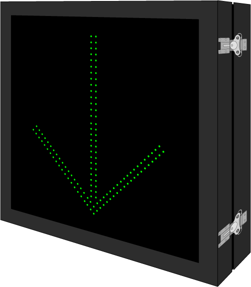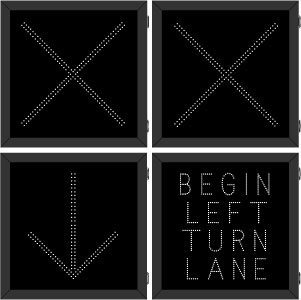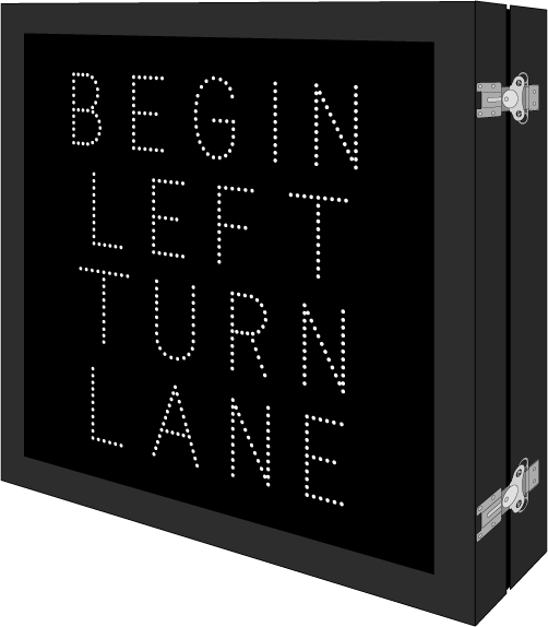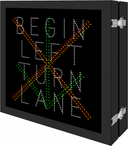 This DOT Series X | X | Down Arrow | BEGIN LEFT TURN LANE sign is a direct-view LED design that illuminates red, amber, green, or white when activated and blanks out when deactivated. Outside cabinet dimensions are 38.000" x 38.000" x 6.500".