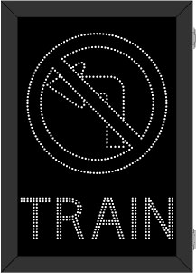 This DOT Series No Left Turn Symbol W/ TRAIN sign is a direct-view LED design that illuminates when activated and blanks out when deactivated. Outside cabinet dimensions are 41.000" x 29.000" x 6.500".