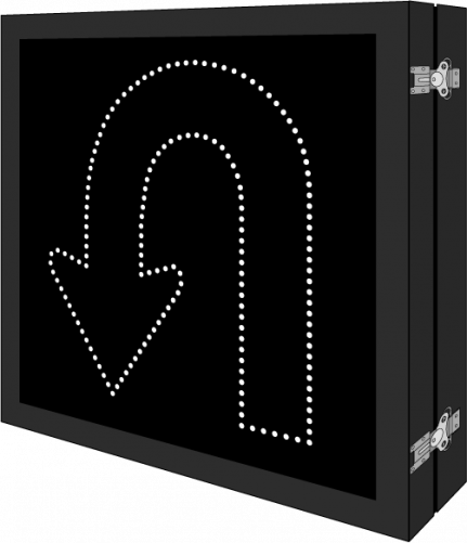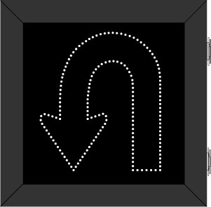 This DOT Series U-Turn Symbol sign is a direct-view LED design that illuminates when activated and blanks out when deactivated. Outside cabinet dimensions are 23.000" x 23.000" x 6.500".