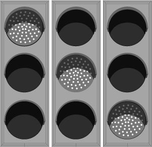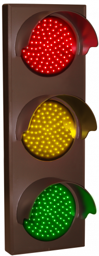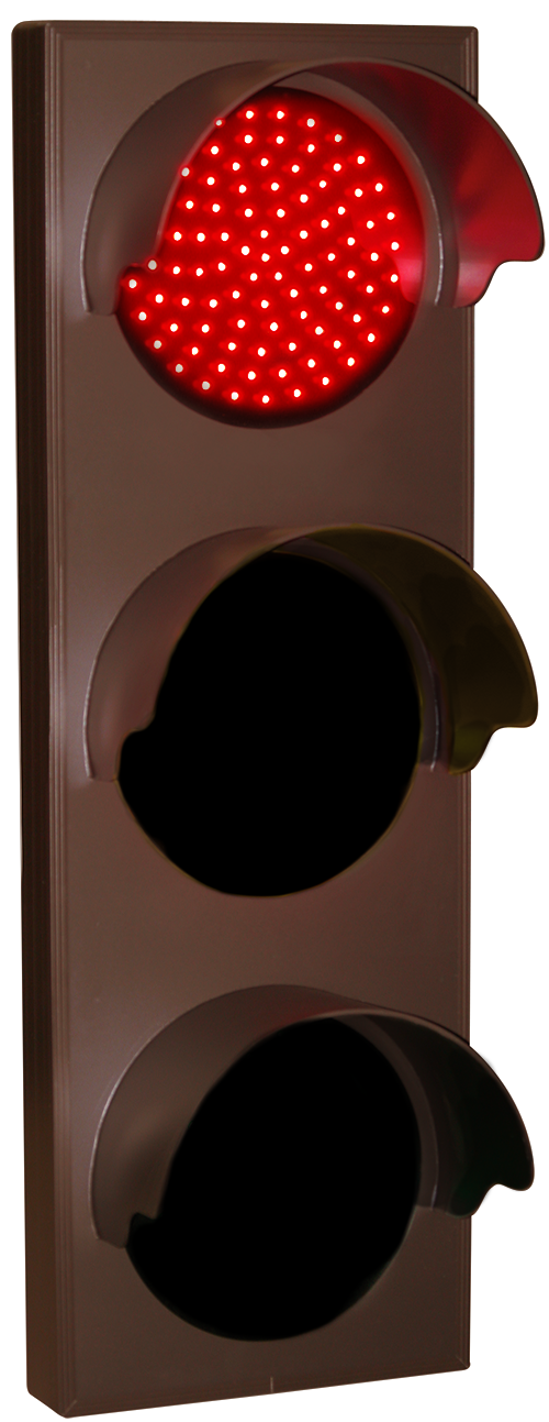 This TCL Series Indicator Dots, Triple with Hoods, Vertical, 4 in dia, Red - Amber - Green outdoor, blank-out sign is designed with super bright LEDs and a contrasting face; we guarantee it's readable in direct sunlight. The sign message is formed by visible LEDs on a black sign face and is designed to illuminate the message(s) when turned on and blank out or extinguish the message when off.