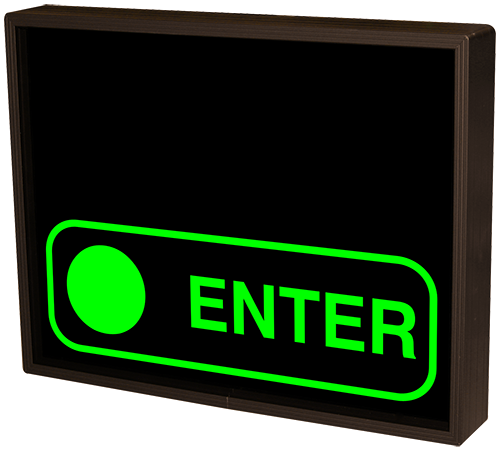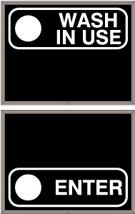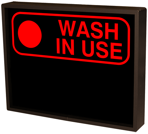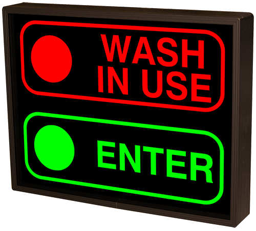 This PHX Series Red Indicator Dot WASH IN USE w/Border | Green Indicator Dot ENTER w/Border outdoor, blankout sign is designed with high-intensity, LED reflected, backlit illumination and a block letter-style message face. The sign message illuminates when turned on and blanks out or extinguishes when off. PHX Series signs are guaranteed readable in direct sunlight.