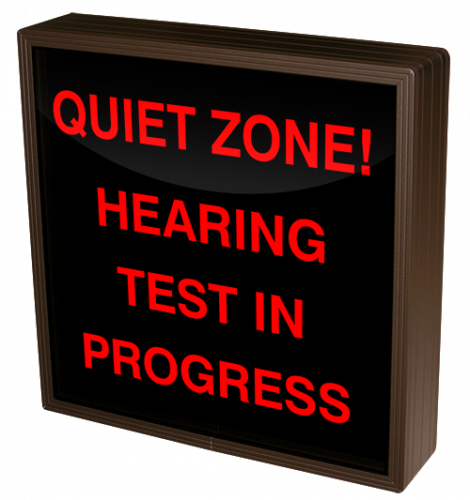 This SBL Series QUIET ZONE! HEARING TEST IN PROGRESS indoor, blankout, LED backlit sign is designed with a matrix of energy efficient LEDs illuminating a block-style message. The sign features blankout technology that only displays the sign message when illuminated.