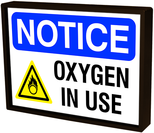 This SBLF Series Exclamation symbol CAUTION Exclamation symbol w/ Oxygen in use No Smoking Symbol No smoking No Open Flames symbol No open flames indoor, LED backlit sign features a block-style message that is readable without illumination. The message is viewable when off and can be illuminated to add emphasis to the message or to optimize readability in low light conditions.
