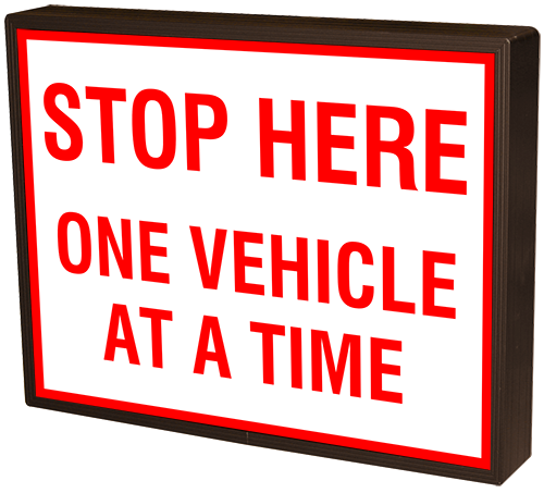 This TCL Series STOP HERE | PROCEED SLOWLY outdoor, blank-out sign is designed with super bright LEDs and a contrasting face; we guarantee it's readable in direct sunlight. The sign message is formed by visible LEDs on a black sign face and is designed to illuminate the message(s) when turned on and blank out or extinguish the message when off.