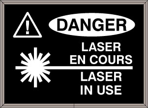 This SBL Series DANGER LASER EN COURS LASER IN USE w/Caution Symbols indoor, blankout, LED backlit sign is designed with a matrix of energy efficient LEDs illuminating a block-style message. The sign features blankout technology that only displays the sign message when illuminated.