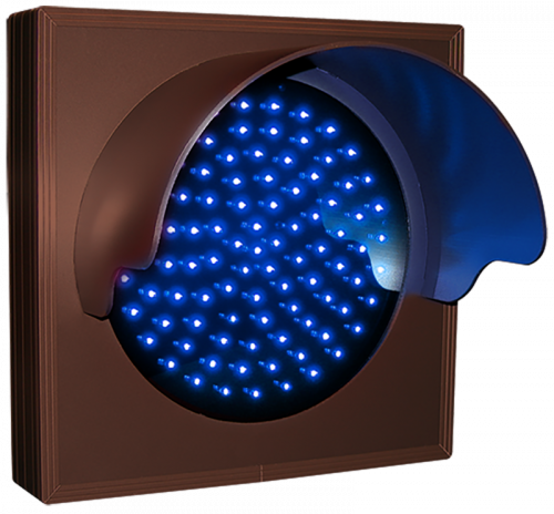 This TCL Series Indicator Dot, Single with Hood and Optional Flashing, 4 in dia, Blue (12-24VDC) outdoor, blank-out sign is designed with super bright LEDs and a contrasting face; we guarantee it's readable in direct sunlight. The sign message is formed by visible LEDs on a black sign face and is designed to illuminate the message(s) when turned on and blank out or extinguish the message when off.