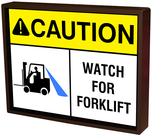 This SBLF Series Exclamation w/ Triangle CAUTION WATCH FOR FORKLIFT w/ Forklift Symbol indoor, LED backlit sign features a block-style message that is readable without illumination. The message is viewable when off and can be illuminated to add emphasis to the message or to optimize readability in low light conditions.