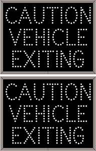 This TCL Series CAUTION VEHICLE EXITING | CAUTION VEHICLE EXITING outdoor, blank-out sign is designed with super bright LEDs and a contrasting face; we guarantee it's readable in direct sunlight. The sign message is formed by visible LEDs on a black sign face and is designed to illuminate the message(s) when turned on and blank out or extinguish the message when off.