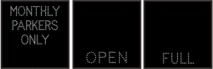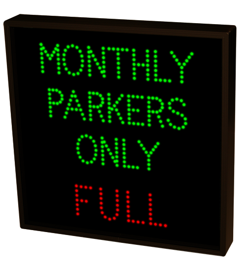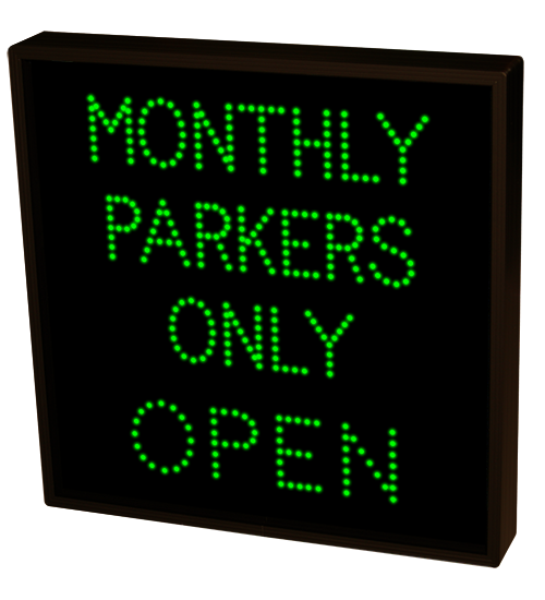 This TCL Series MONTHLY PARKERS ONLY | OPEN | FULL (120-277VAC) outdoor, blank-out sign is designed with super bright LEDs and a contrasting face; we guarantee it's readable in direct sunlight. The sign message is formed by visible LEDs on a black sign face and is designed to illuminate the message(s) when turned on and blank out or extinguish the message when off.