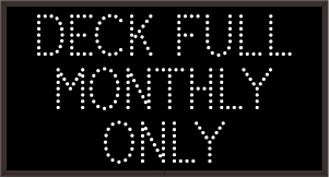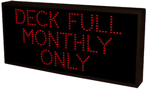 This TCL Series DECK FULL MONTHLY ONLY (12-24VDC) outdoor, blank-out sign is designed with super bright LEDs and a contrasting face; we guarantee it's readable in direct sunlight. The sign message is formed by visible LEDs on a black sign face and is designed to illuminate the message(s) when turned on and blank out or extinguish the message when off.